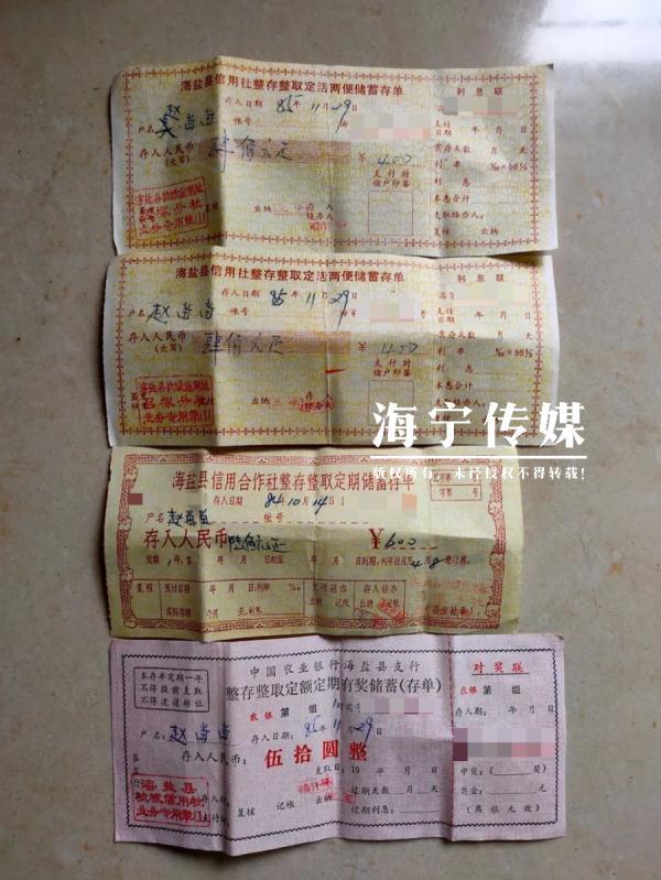 这几张老存单保存完好,抬头写着海盐县信用社整存整取定活两便储蓄存单,海盐县信用合作社整存整取定期储蓄存单和中国农业银行海盐县支行整存整取定额定期有奖储蓄(存单),户主姓名赵留留,存入日期分别是1984年10月14日,1985年11月29日,四张存单的总金额是1450元,其中一张写着月息4厘8毫,两张存单左下角盖着“海盐县于城信用社吕冢分社”的红色公章。