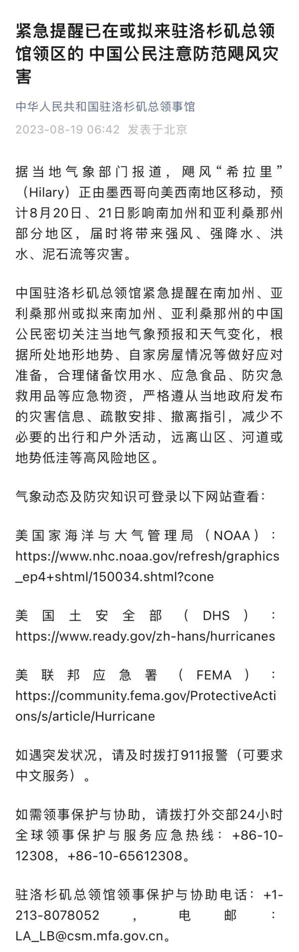 当地时间8月19日,中国驻洛杉矶总领事馆微信公众号发布消息称,据当地气象部门报道,飓风“希拉里”(Hilary)正由墨西哥向美西南地区移动,预计8月20日、21日影响南加州和亚利桑那州部分地区,届时将带来强风、强降水、洪水、泥石流等灾害。