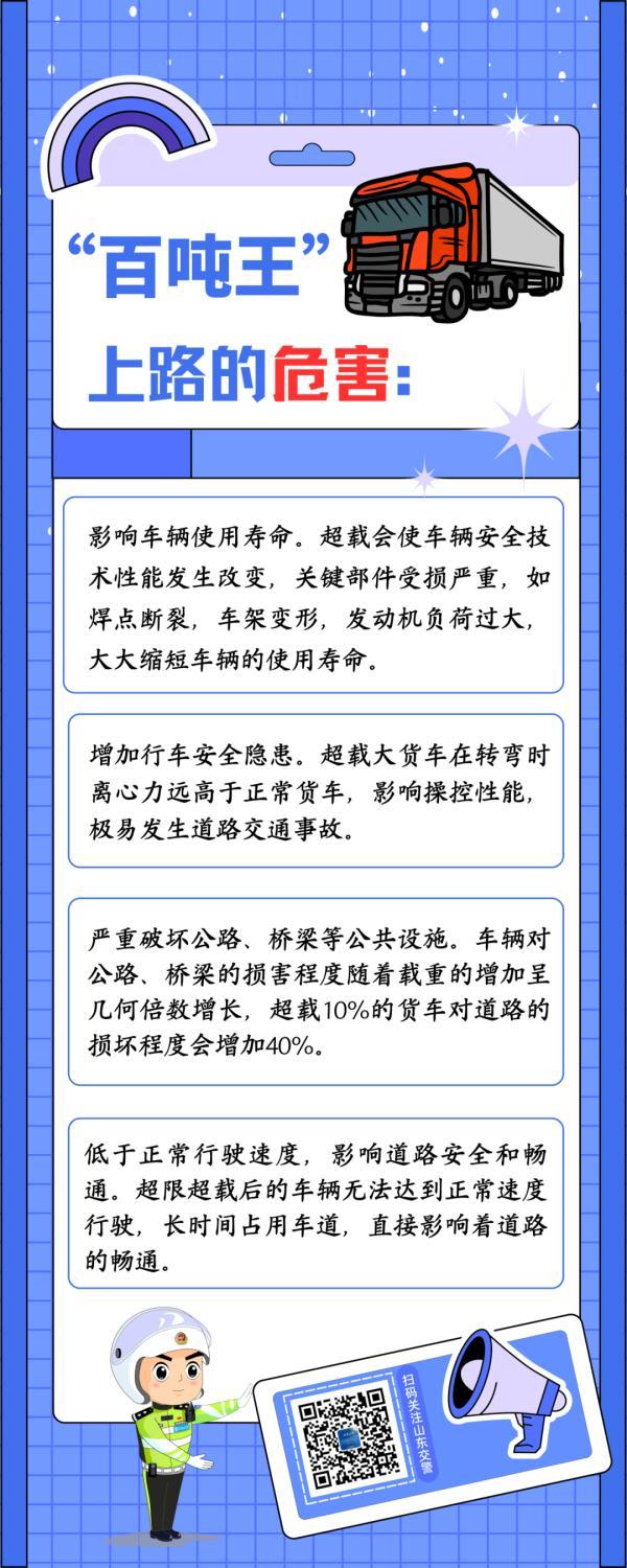 “百吨王”是指车货总重达100吨以上的严重超载超限违法货运车辆。严重超载超限不仅会直接损害公路和桥梁运行安全,还严重影响车辆制动性能,很容易引发惨痛的道路交通事故。