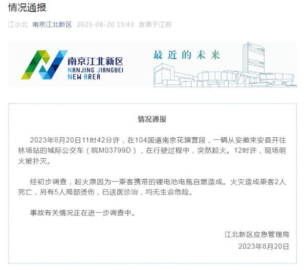 据“南京江北新区”微信公众号20日消息,2023年8月20日11时42分许,在104国道南京花旗营段,一辆从安徽来安县开往林场站的城际公交车(皖M03799D),在行驶过程中,突然起火。12时许,现场明火被扑灭。