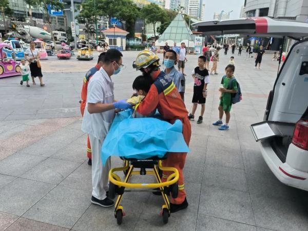 脱困后,男孩脚背红肿,消防员快速将男孩转移至救护车上,送往医院进一步检查治疗。