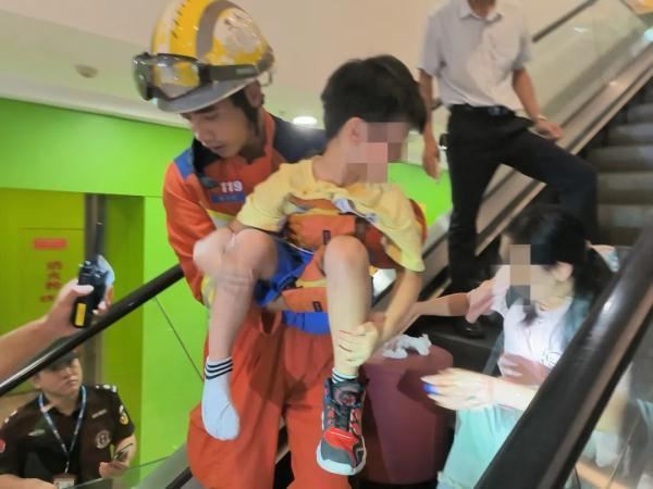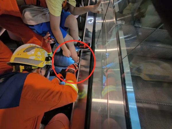 有一名男孩右脚被卡在2楼手扶电梯处
