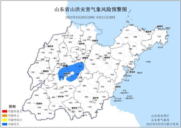 预计8月20日20时至8月21日20时,济南、泰安、淄博等市局部地区可能发生山洪灾害(蓝色预警)。
