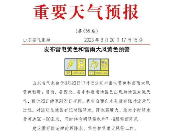 山东省气象台8月20日17时15分发布雷电黄色和雷雨大风黄色预警:目前,鲁西北、鲁中和鲁南地区已出现局地强对流天气,预计20日傍晚到21日夜间,山东自西向东先后有强对流天气过程。对流明显地区有短时强降水,降水强度大,最大小时降水量可达50~80毫米,同时伴有明显雷电和7~9级雷雨阵风。