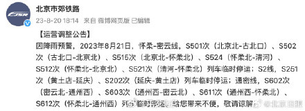 据@北京市郊铁路 消息,因降雨预警,2023年8月21日,部分列车临时停运——怀柔-密云线 S501次(北京北-古北口) S502次(古北口-北京北) S515次(北京北-怀柔北) S524次(怀柔北-清河)S512次(怀柔北-北京北) S521次(清河-怀柔北) S2线 S251次(黄土店-延庆) S202次(延庆-黄土店) 通密线S602次(密云北-通州西) S603次(通州西-密云北) S611次(通州西-怀柔北) S612次(怀柔北-通州西)