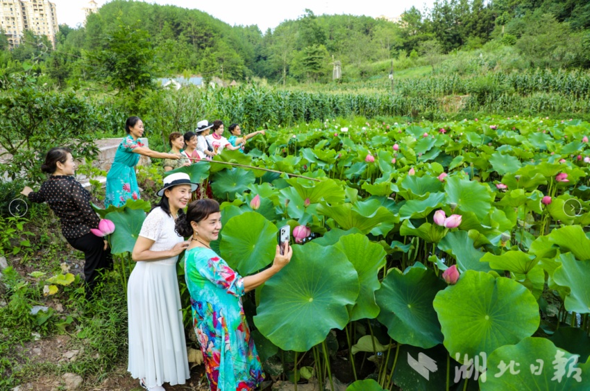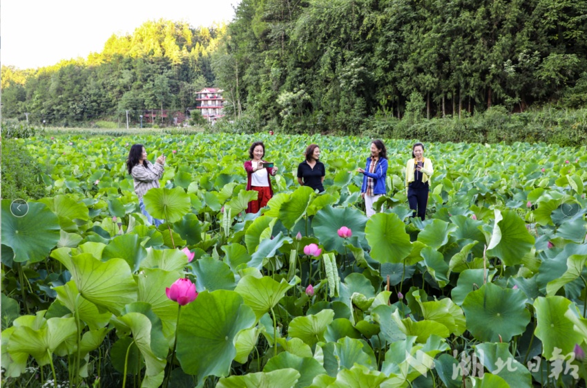 湖北日报客户端讯(通讯员郭贤乐、王峰)8月18日,利川市谋道镇民生村的荷花盛开,一群在这里避暑的人和游客在荷花边赏花采莲。这里海拔1500米高,荷花比一般迟开一个多月,也正是苏马荡景区避暑的高峰期,来这里享受着清凉和美丽的田园风光。