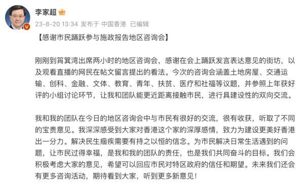咨询会后,李家超于社交媒体发文,感谢在会上踊跃发言表达意见的街坊,以及观看直播的网民在帖文留言提出的看法。李家超说,深深感受到大家对香港这个家的深厚感情。他强调,解决民生痼疾需要有持之以恒的信念。