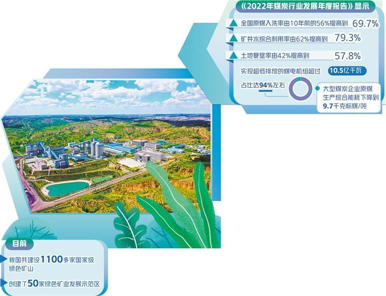 《2022年煤炭行业发展年度报告》显示,我国煤炭行业着力推动绿色低碳转型,协同推进降碳、减污、扩绿、增长。全国原煤入洗率由10年前的56%提高到69.7%,矿井水综合利用率由62%提高到79.3%,土地复垦率由42%提高到57.8%;实现超低排放的煤电机组超过10.5亿千瓦,占比达94%左右;大型煤炭企业原煤生产综合能耗下降到9.7千克标煤/吨。