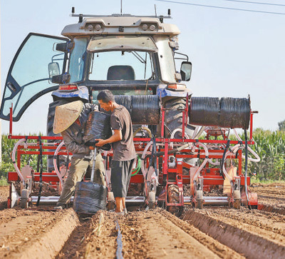 8月18日,河北省涿州市刁窝镇潘各庄村,工作人员为播种机安装滴灌带,进行灾后复耕补种。 新华社记者 骆学峰摄 |