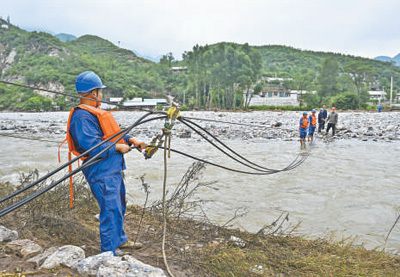 日前,河北省保定市涞水县其中口乡,国网河北省平山县供电公司抗洪救灾救援队抢修供电设施。 张学农摄(人民视觉) |