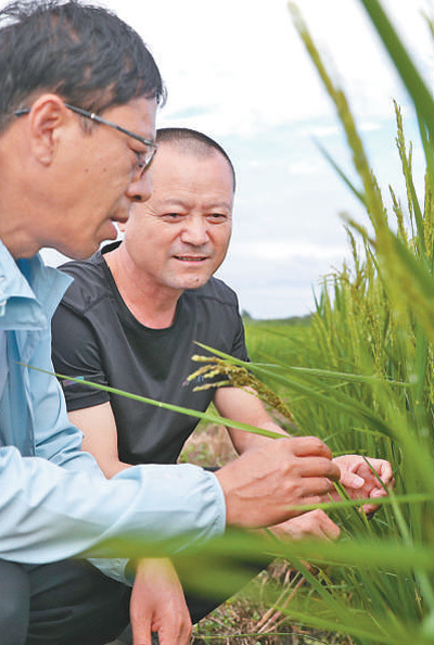 日前,黑龙江省尚志市农业技术推广中心的工作人员在当地一处被洪水浸泡过的水稻田里查看水稻情况。 新华社记者 张 涛摄 |