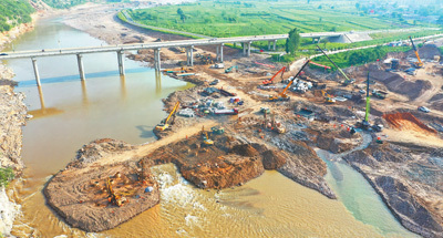 8月19日,河北省石家庄市井陉县石太铁路货运线路甘陶河铁路桥水毁桥梁施工现场。 邵玉姿 邓俭生摄影报道 |