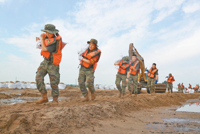 8月18日,北部战区陆军某旅官兵对吉林省扶余市弓棚子镇拉林河下游缺口处进行封堵。 李朝阳 周程程摄影报道 |