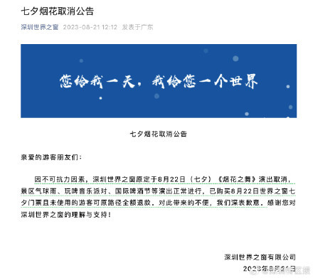 因不可抗力因素,深圳世界之窗原定于8月22日(七夕)《烟花之舞》演出取消,景区气球雨、玩啤音乐派对、国际啤酒节等演出正常进行,已购买8月22日世界之窗七夕门票且未使用的游客可原路径全额退款。对此带来的不便,我们深表歉意。感谢您对深圳世界之窗的理解与支持!(世界之窗)