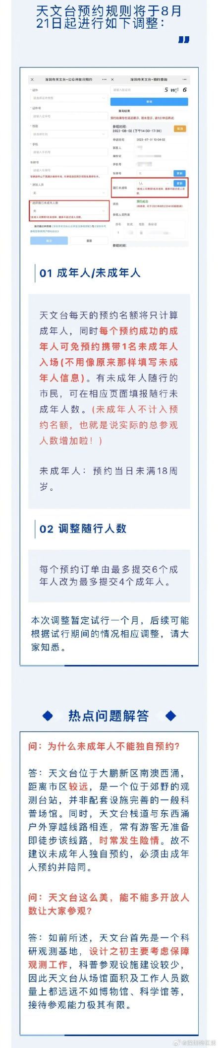 8月21日起,深圳天文台调整预约规则,每个预约订单最多提交6个成年人改为最多提交4个成年人,预约成功的成年人可携带1名未成年人入场。(深圳天文)