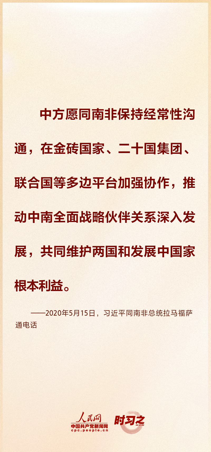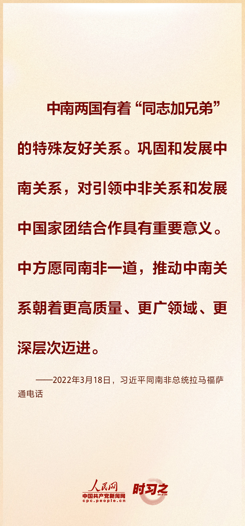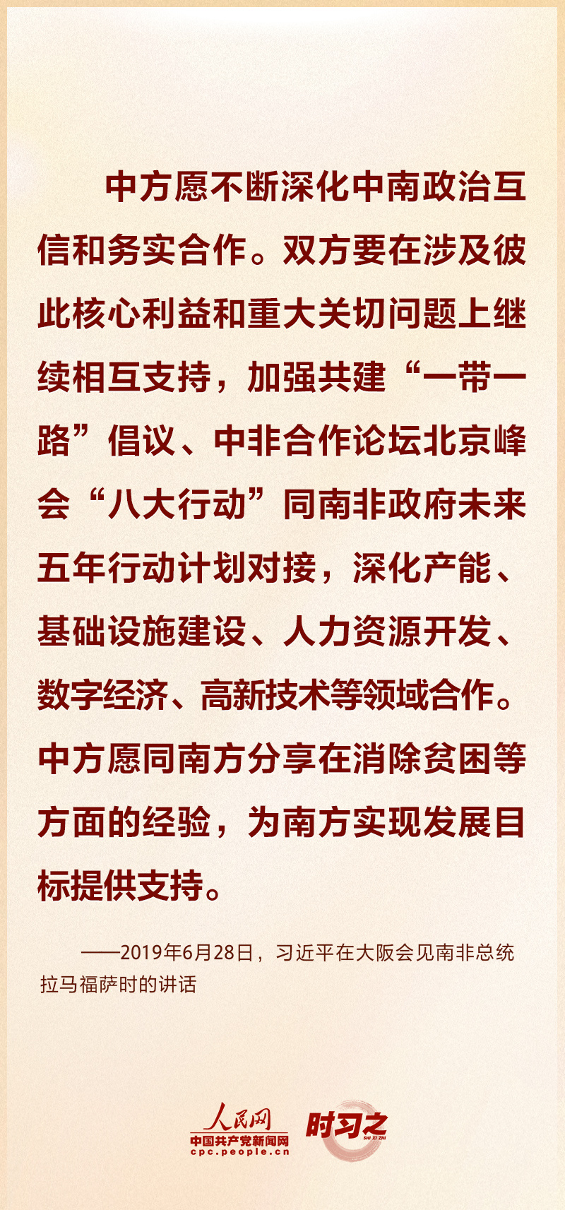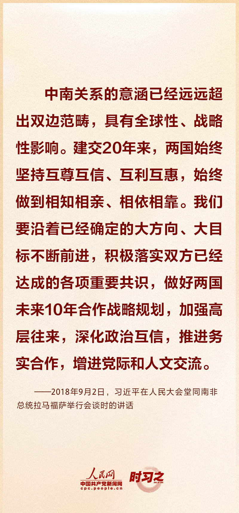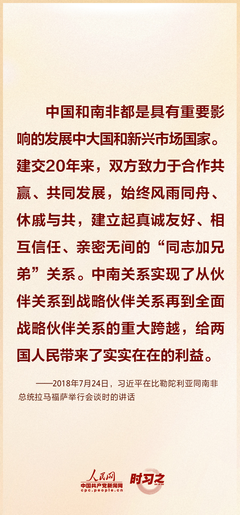 今年是中南建交25周年,也是金砖“南非年”。中国和南非都是重要的发展中大国,两国有着兄弟般的特殊友好关系。习近平主席曾在多个场合阐释中南关系、中南友谊、中南合作,积极推动构建高水平中南命运共同体。