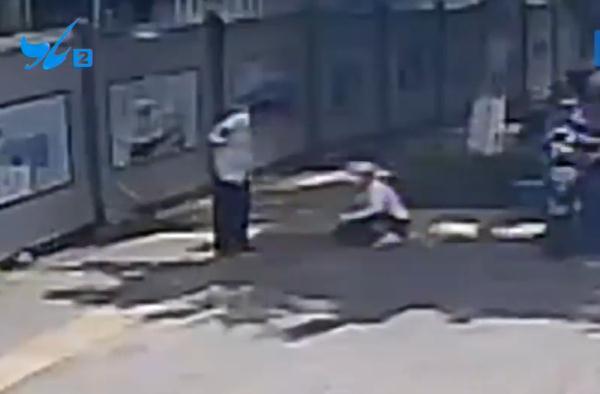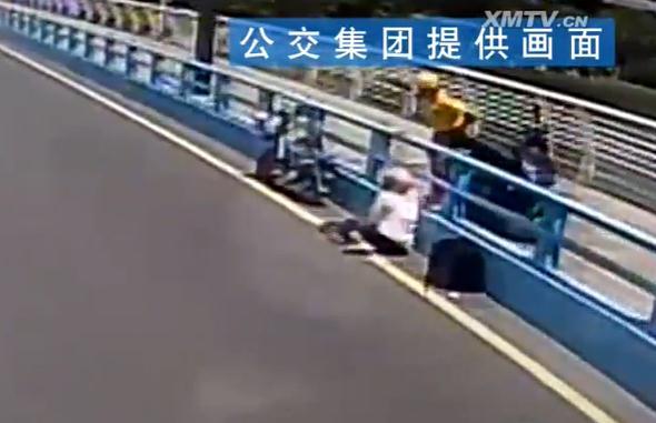 当时的反应可能是中暑,中暑了我说中午一点半左右天气比较热,在桥面上不安全,我就想着立刻给她转移到车上,因为我车上有空调,然后把她转移到安全的地方是最好的选择。