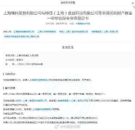 天眼查网站显示,近期,上海臻料贸易有限公司与钟茂(上海)食品科技有限公司等诉前财产保全裁定书公开。文书显示,申请人上海臻料贸易有限公司于7月21日向法院申请诉前财产保全,请求对被申请人钟茂(上海)食品科技有限公司、钟薛高食品(上海)有限公司名下银行存款550万元或者对相等价值的财产或财产性权益予以冻结或查封。法院经审查认为申请人的申请符合法律规定,裁定执行。天眼查网站显示,钟茂(上海)食品科技有限公司由钟薛高食品(上海)有限公司全资持股。(中新财经)