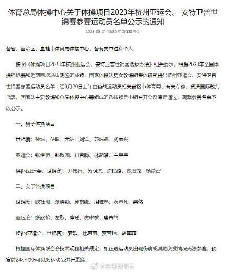 北京时间8月21日,中国体操队杭州亚运会、安特卫普世锦赛参赛运动员名单出炉根据规定,如正选运动员出现伤病或其他突发情况无法参赛,预赛前24小时仍可以对运动员进行更换。
