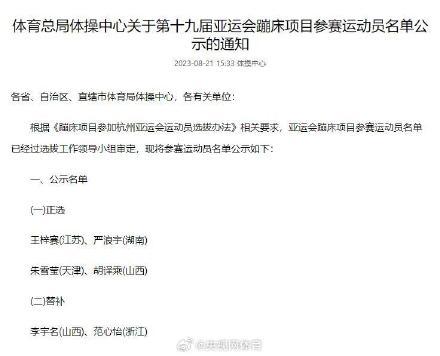 北京时间8月21日,体育总局体操中心公布杭州亚运会蹦床项目参赛运动员名单,四名正选运动员为王梓赛(江苏)、严浪宇(湖南)、朱雪莹(天津)、胡译乘(山西),两名替补运动员为李宇名(山西)、范心怡(浙江)。