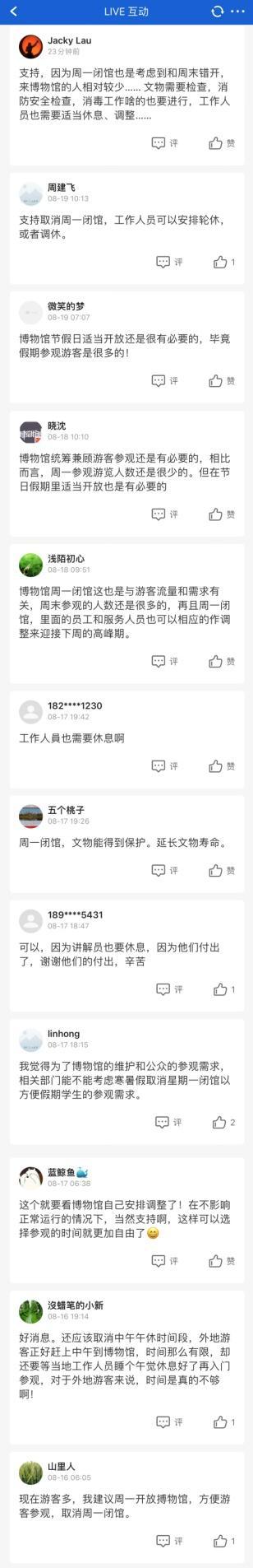 江苏新闻广播记者在南京的几个博物馆门口采访时,也真实感受了一把火爆的参观热情。不过,对于是否取消周一闭馆,大家考虑的角度也很多元。在我们的大蓝鲸平台上,话题讨论同样踊跃,网友们支持取消周一闭馆的理由都是方便参观;不过,也有网友担心,取消闭馆影响文物的寿命,毕竟文物是博物馆的精华所在。