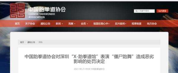 8月21日,中国跆拳道协会官网发布对深圳“X-跆拳道馆”表演“僵尸跆舞”造成恶劣影响的处罚决定。