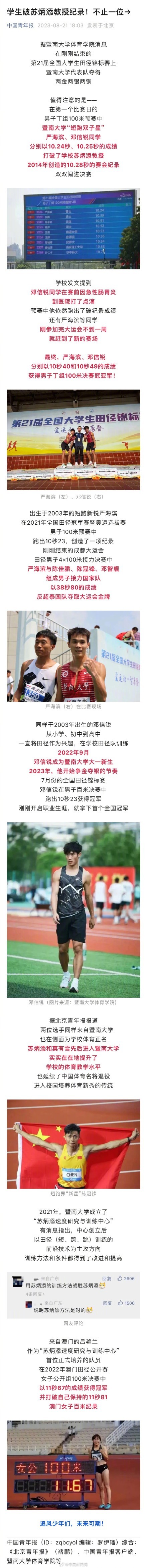 据暨南大学体育学院消息,在第21届全国大学生田径锦标赛第一个比赛日,男子丁组100米预赛中,暨南大学“短跑双子星”严海滨、邓信锐同学,分别以10.24秒、10.25秒的成绩,打破了学校苏炳添教授2014年创造的赛会纪录,闯进决赛。最终,严海滨、邓信锐分别以10秒40和10秒49的成绩获得该组决赛冠亚军!2021年,暨南大学成立了“苏炳添速度研究与训练中心”,中心创立后,以田径(短、跨、跳)训练的前沿技术为主攻方向训练方法和条件都得到了改进和提高。网友:用苏炳添的训练方法战胜苏炳添(中国青年报)
