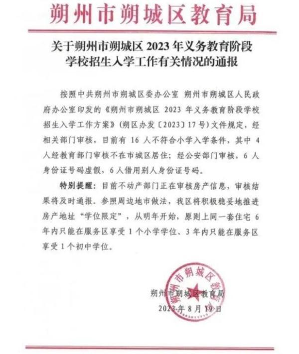 近日,山西省朔州市朔城区教育局通报2023年义务教育阶段学校招生入学工作情况。经相关部门审核,目前有16人不符合小学入学条件,其中4人经教育部门审核不在市城区居住。经公安部门审核,6 人身份证号码虚假,6人借用别人身份证号码。