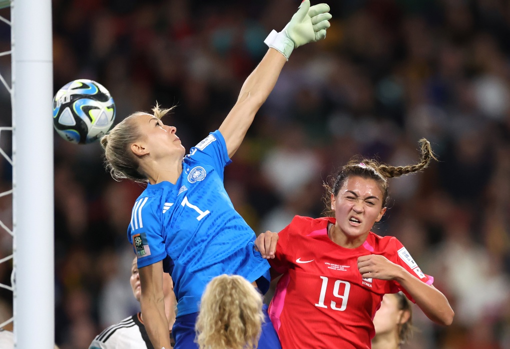 8月3日,韩国队球员凯西·费尔(右)与德国队守门员默勒·弗罗姆斯在门前争抢。新华社记者张晨摄