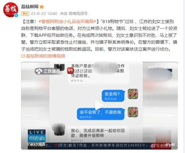 “818购物节”过后,江苏的刘女士接到自称是购物平台客服的电话,对方让其领小礼物。随后,刘女士被拉进了一个投资群,下载APP后开始做任务。在完成两次转账后,刘女士意识到不对劲,马上报了警。警方立即采取紧急性止付措施,并与骗子联系表明身份。在警方的震慑下,骗子当场把刘女士被骗的钱款如数退回。目前,警方对该案依法立案并进行侦办。
