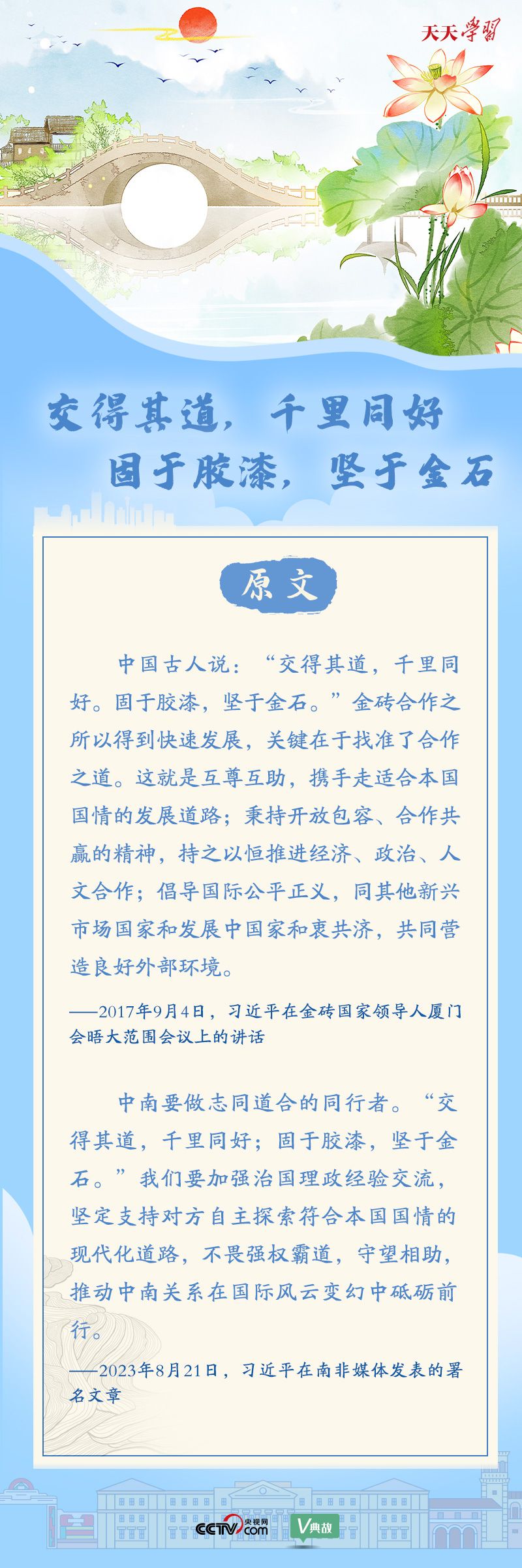 8月21日,在赴约翰内斯堡出席金砖国家领导人第十五次会晤并对南非进行国事访问之际,习近平主席在南非《星报》《开普时报》《水星报》和南非独立媒体网站发表题为《让中南友好合作的巨轮扬帆远航》的署名文章。他引用中国古语“交得其道,千里同好;固于胶漆,坚于金石”,盛赞中南两国是志同道合的同行者。在2017年金砖国家领导人厦门会晤大范围会议上,习近平主席也引用这句古语,指出金砖合作之所以得到快速发展,关键在于找准了合作之道。