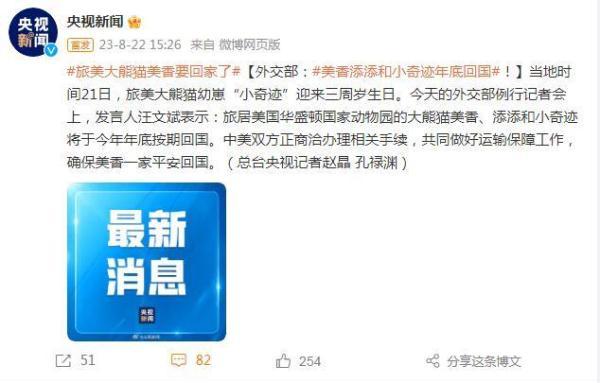 当地时间21日,旅美大熊猫幼崽“小奇迹”迎来三周岁生日。今天的外交部例行记者会上,发言人汪文斌表示:旅居美国华盛顿国家动物园的大熊猫美香、添添和小奇迹将于今年年底按期回国。中美双方正商洽办理相关手续,共同做好运输保障工作,确保美香一家平安回国。(总台央视记者赵晶孔禄渊)