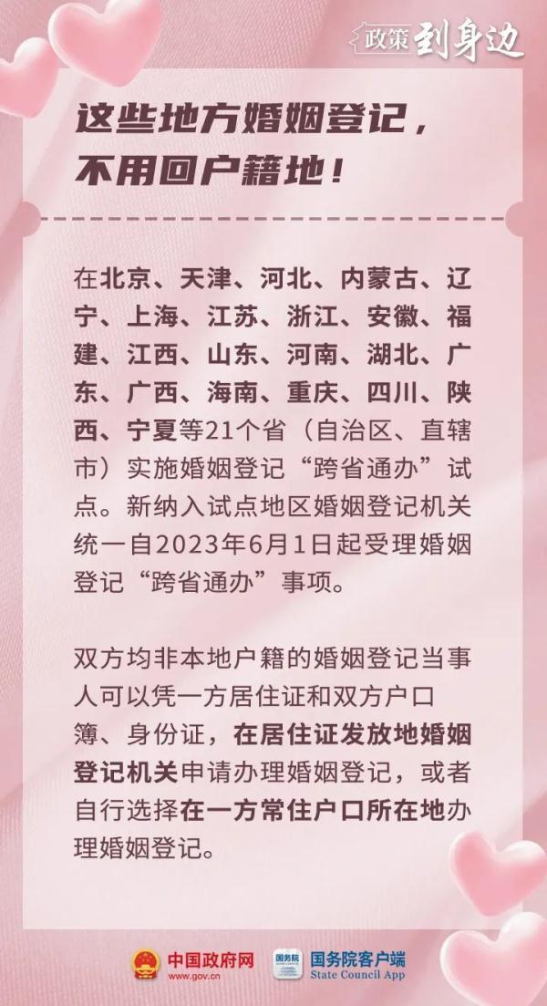 在北京、天津、河北、内蒙古、辽宁、上海、江苏、浙江、安徽、福建、江西、山东、河南、湖北、广东、广西、海南、重庆、四川、陕西、宁夏等21个省(自治区、直辖市)实施结婚登记和离婚登记“跨省通办”试点。