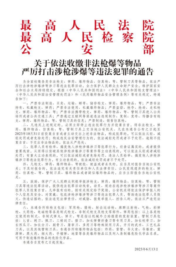 记者获悉,《关于依法收缴非法枪爆等物品严厉打击涉枪涉爆等违法犯罪的通告》发布后,法院部门主要把握好两个方面: