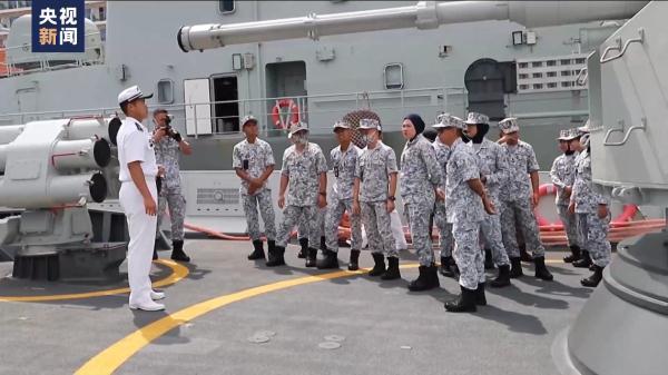 17日8时30分,悬挂着中马两国国旗的编队舰艇驶入巴生港区,官兵们在甲板上整齐列队,向码头欢迎人群挥手致意。中国驻马来西亚使领馆工作人员、当地中资机构人员、华人华侨,马来西亚海军官兵代表、军乐队等200余人在码头迎接。