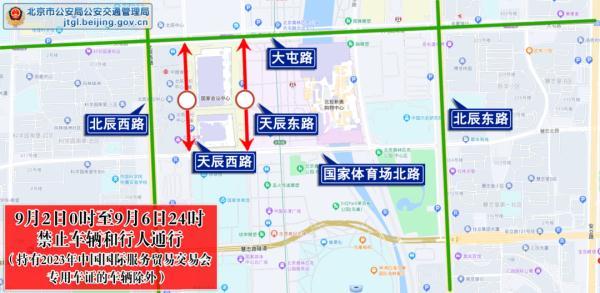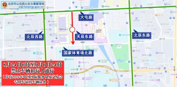 (二)9月2日0时至9月6日24时,天辰东路由国家体育场北路与天辰东路交叉口(不含)至大屯路与天辰东路交叉口(不含)南向北方向、天辰西路由国家体育场北路与天辰西路交叉口(不含)至大屯路与天辰西路交叉口(不含)南北双方向,禁止车辆和行人通行。途经车辆和行人可经北辰东路、北辰西路、大屯路绕行。