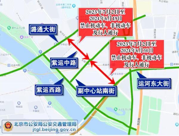 为保证北京城市副中心站综合交通枢纽工程施工期间的道路交通安全与畅通,根据道路交通安全法律法规有关规定,决定通州区紫运中路(紫运中路与潞通大街相交路口至紫运中路与副中心站南街相交路口)禁止机动车、非机动车及行人通行的交通管理措施延期至2024年6月19日,过往车辆及行人可绕行副中心站南街、紫运西路、潞通大街等周边道路通行。
