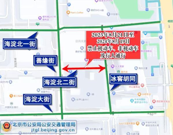 为保证鼎好电子大厦B座升级改造项目施工期间的道路交通安全与畅通,根据道路交通安全法律法规有关规定,决定2023年8月21日至2024年8月19日,海淀区海淀北二街(海淀北二街与善缘街相交路口至海淀北二街与冰窖胡同相交路口)禁止机动车、非机动车及行人通行,过往车辆及行人可绕行善缘街、海淀北一街、海淀大街、冰窖胡同等周边道路通行。