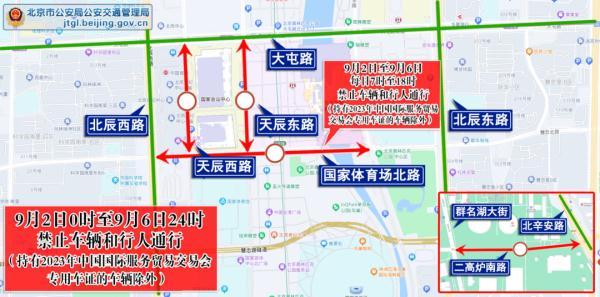 (三)9月2日至9月6日,每日7时至18时,国家体育场北路由北辰西路与国家体育场北路交叉口(不含)至湖景东路与国家体育场北路交叉口(不含)东西双方向、二高炉南路由北辛安路与二高炉南路交叉口(不含)至群名湖大街与二高炉南路交叉口(不含)东西双方向,禁止车辆和行人通行。途经车辆和行人可经北辰东路、北辰西路、科荟南路、大屯路、北四环路、北辛安路、石景山路、广宁路绕行。