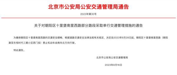 为确保朝阳区十里堡南里西路的交通安全顺畅,根据道路交通安全法律法规有关规定,决定自2023年8月28日起,朝阳区十里堡南里西路(朝阳路至东恒时代三期小区西门段)禁止机动车由南向北方向行驶。