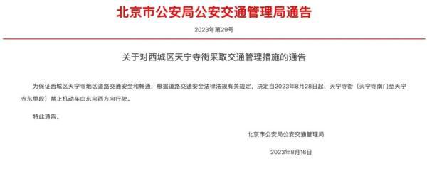 为保证西城区天宁寺地区道路交通安全和畅通,根据道路交通安全法律法规有关规定,决定自2023年8月28日起,天宁寺街(天宁寺南门至天宁寺东里段)禁止机动车由东向西方向行驶。