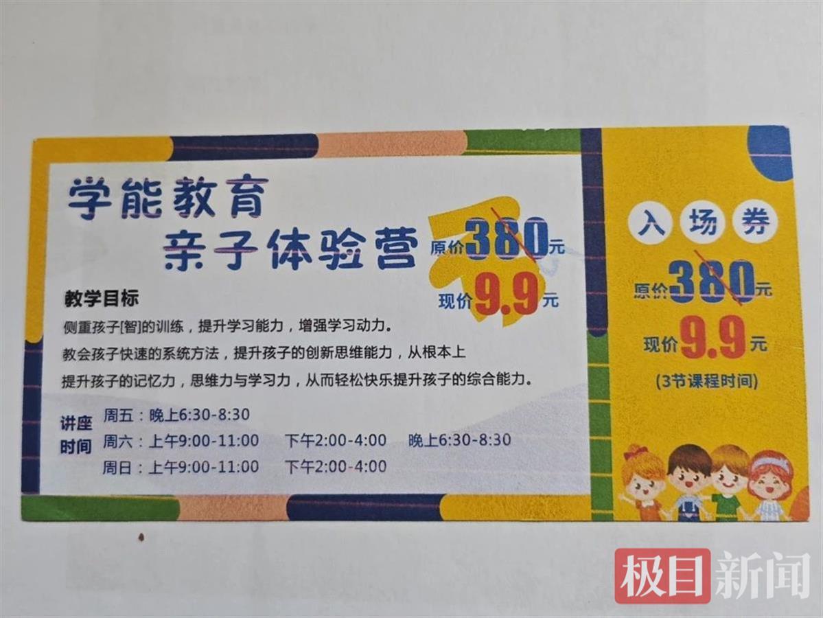 6月初,一伙人在洪湖市的学校、商超等人员密集地频繁发放印有“高效学习法”“提高学生记忆力、专注力”等醒目字样的传单,产生浓厚兴趣的学生家长看到传单的落款是当地一家大型知名教育机构。“可以先来参加我们的试听课,价值380元的课程只需9.9元就可以参加。”宣传人员趁热打铁,对咨询家长热情介绍。