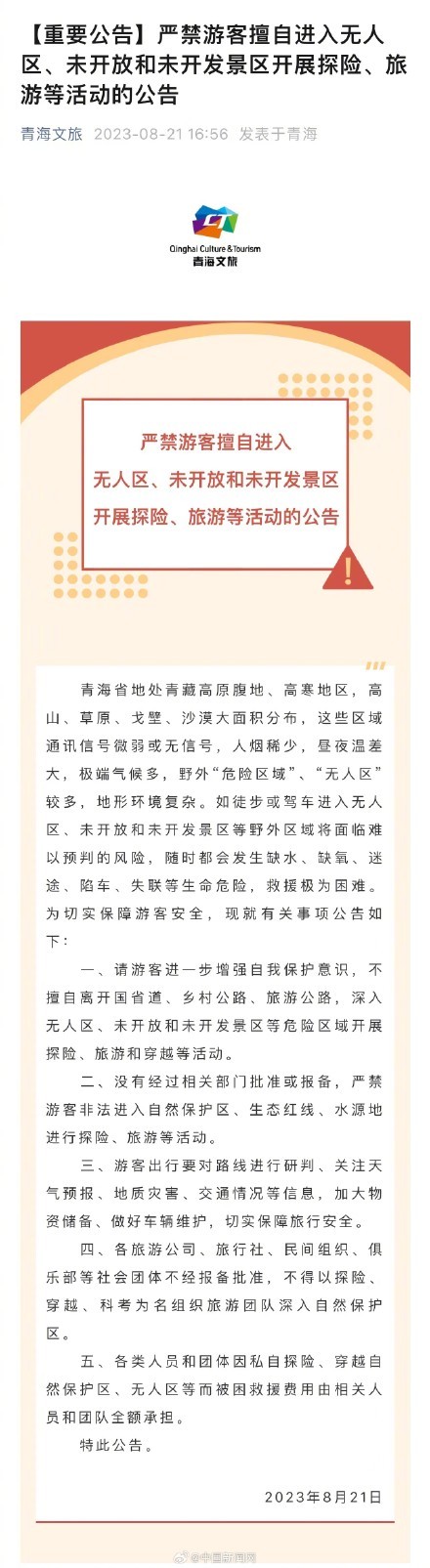 青海文旅日前发布“严禁游客擅自进入无人区、未开放和未开发景区开展探险、旅游等活动的公告”,公告中提到,请游客进一步增强自我保护意识,不擅自离开国省道、乡村公路、旅游公路,深入无人区、未开放和未开发景区等危险区域开展探险、旅游和穿越等活动。各类人员和团体因私自探险、穿越自然保护区、无人区等而被困救援费用由相关人员和团队全额承担。(青海文旅)