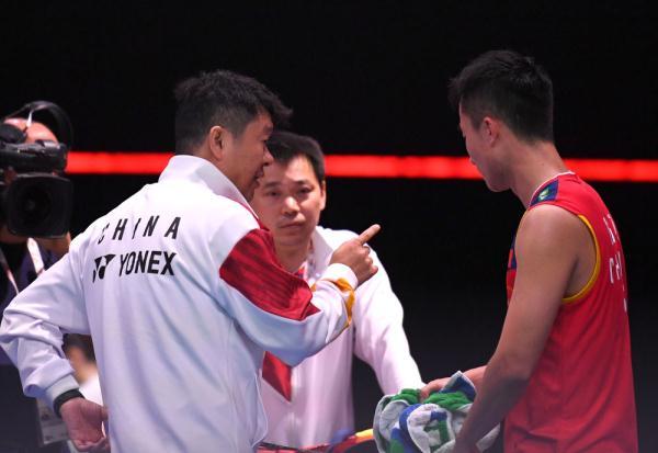 ↑陆光祖(右)在比赛间隙接受教练孙俊(左)指导。