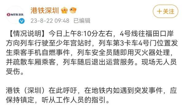 据港铁深圳官方微博消息,8月22日上午8时10分左右,地铁4号线往福田口岸方向列车行驶至少年宫站时,列车第3卡车4号门位置发生乘客手机自燃事件,列车安全员随即用灭火器处理,并疏散车厢乘客,列车随后退出运营服务。现场无人员受伤。