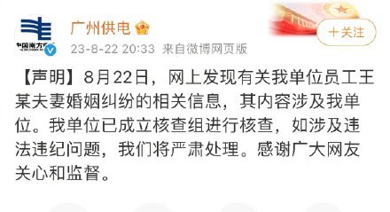 8月22日,网上发现有关我单位员工王某夫妻婚姻纠纷的相关信息,其内容涉及我单位。我单位已成立核查组进行核查,如涉及违法违纪问题,我们将严肃处理。感谢广大网友关心和监督。