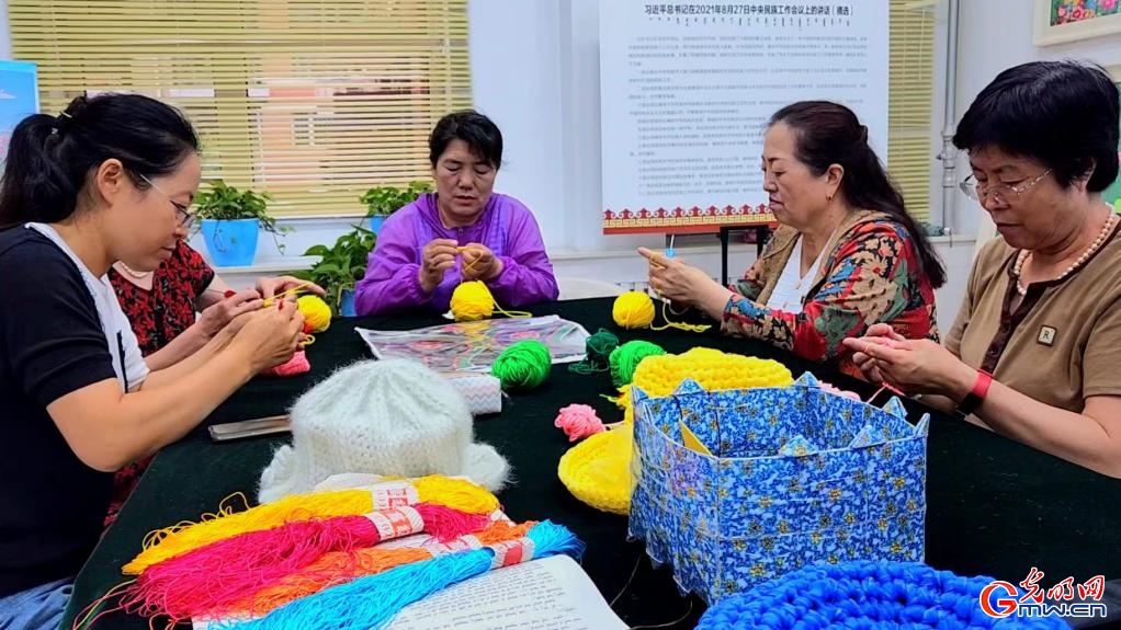 临潢家园社区居民在传统手工技艺课堂上交流编织技巧。王蕾摄
