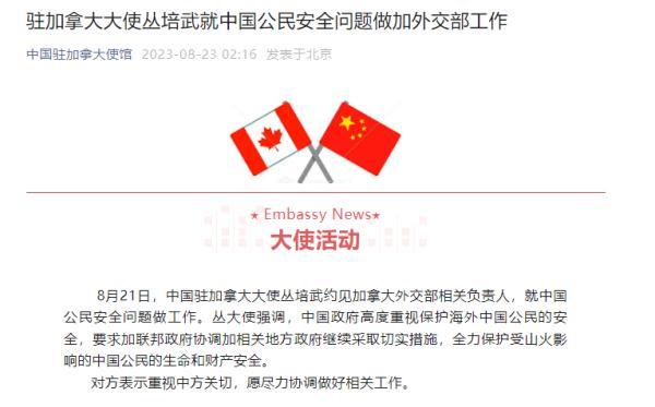 8月21日,中国驻加拿大大使丛培武约见加拿大外交部相关负责人,就中国公民安全问题做工作。丛大使强调,中国政府高度重视保护海外中国公民的安全,要求加联邦政府协调加相关地方政府继续采取切实措施,全力保护受山火影响的中国公民的生命和财产安全。