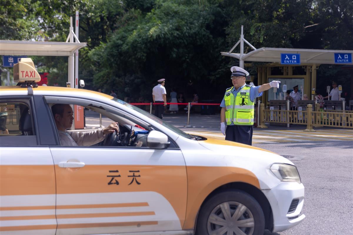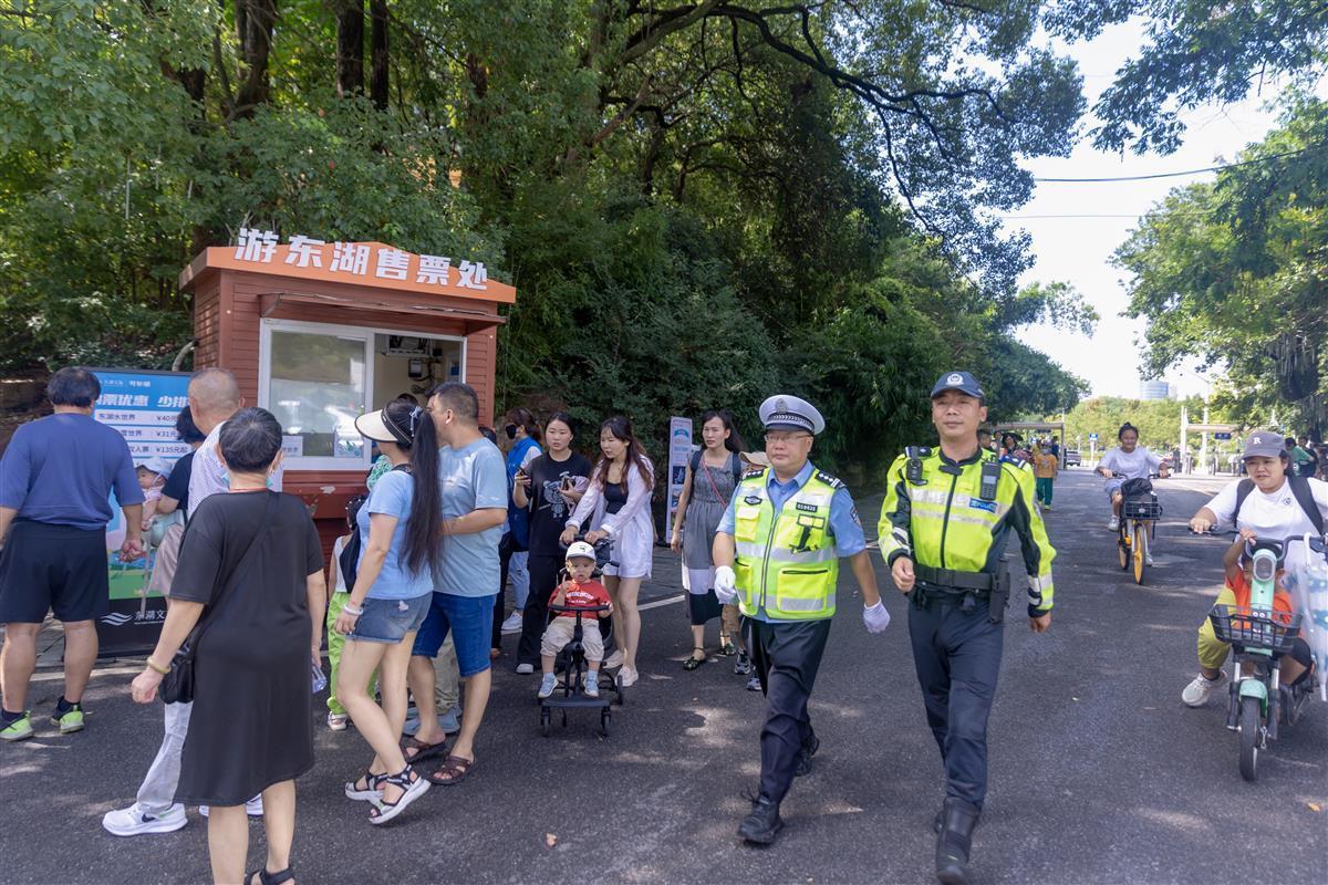 在梨园广场这个东湖人流量最大的入口附近,不时有车送游客在此下车。极目新闻记者看到,站在烈日下执勤的东湖分局民警郭建波和汉警快骑队员周密,已经汗湿衣背。