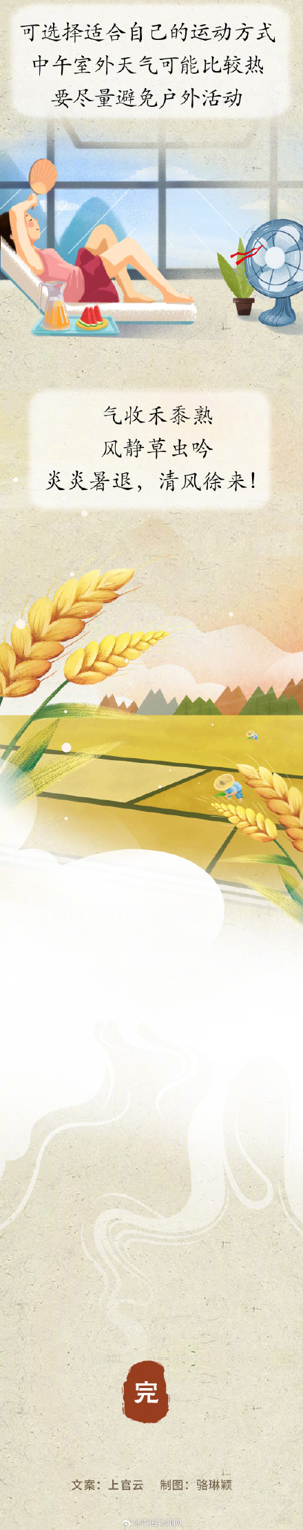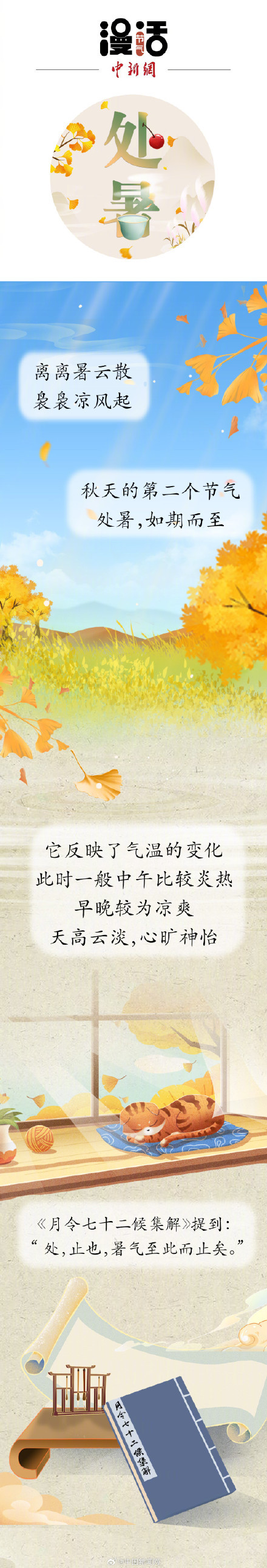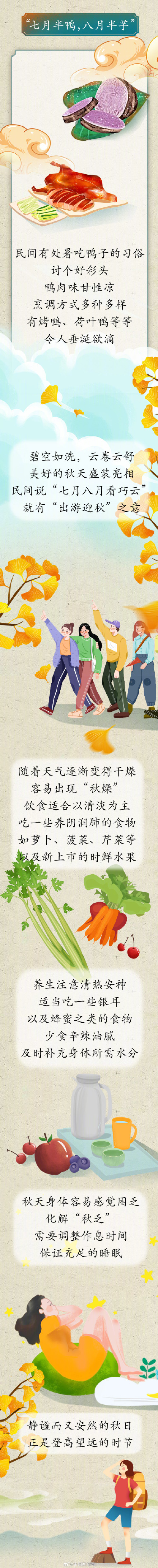 处暑是秋天第二个节气,有一种说法称,暑有炎热之意,处暑就表示“出暑”,暑热缓慢消退,气温已开始总体呈下降趋势。化解“秋乏”,需要调整作息时间,保证充足的睡眠。另外,围绕着这个节气,民间有吃鸭子、出游迎秋等习俗,鸭肉味甘性凉,烹调方式多种多样,令人垂涎欲滴。(记者上官云 骆琳颖)